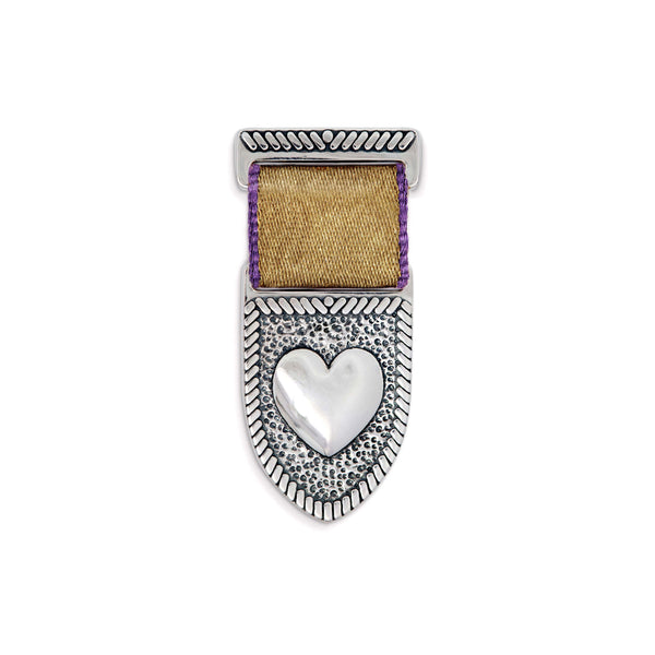 Silver Courageous Love Medal with shield and heart design and gold ribbon with purple trim
