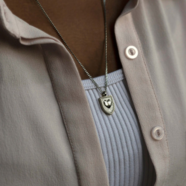 The Courageous Love Necklace features a shield pendant with a heart at its centre, symbolizing strength, resilience, and the courage to overcome life’s challenges while keeping love at our core. Designed for those who bravely protect and embody love, this meaningful piece of symbolic jewellery is a timeless gift or personal keepsake for anyone who values love as their greatest strength.